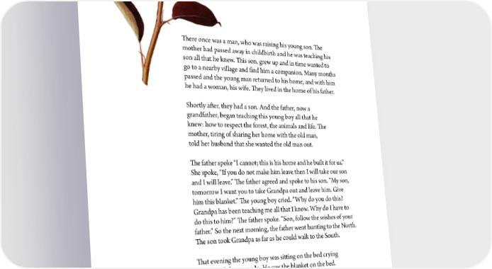 吀栀ere once was a man, who was raising his young son. 吀栀e mother had passed away in childbirth and he was teaching his son all that he knew. 吀栀is son, grew up and in time wanted to go to a nearby village and 昀椀nd him a companion. Many months passed and the young man returned to his home, and with him he had a woman, his wife. 吀栀ey lived in the home of his father. Shortly a昀琀er, they had a son. And the father, now a grandfather, began teaching this young boy all that he knew: how to respect the forest, the animals and life. 吀栀e mother, tiring of sharing her home with the old man, told her husband that she wanted the old man out. 吀栀e father spoke “I cannot; this is his home and he built it for us.” She spoke, “If you do not make him leave then I will take our son and I will leave.” 吀栀e father agreed and spoke to his son. “My son, tomorrow I want you to take Grandpa out and leave him. Give him this blanket.” 吀栀e young boy cried. “Why do you do this? Grandpa has been teaching me all that I know. Why do I have to do this to him?” 吀栀e father spoke. “Son, follow the wishes of your father.” So the next morning, the father went hunting to the North. 吀栀e son took Grandpa as far as he could walk to the South. 吀栀at evening the young boy was si琀琀ing on the bed crying when his father came In. He saw the blanket on the bed. “Son, I thought I told you to give Grandpa the blanket?” “I gave Grandpa half of the blanket. 吀栀e other half, I will give to you some day.” 吀栀e mother and father understood the message. And they went and brought Grandpa back. • Traditional story •