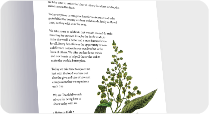 吀栀ere is so much to be thankful for each day. Today we take the time to pause and acknowledge this special season of harvest and its traditions of sharing with those less fortunate. We take time to notice the labor of others, from farm to table, that culminates in this feast. Today we pause to recognize how fortunate we are and to be grateful for the bounty we share with friends, family and loved ones, be they with us or far away. We take pause to celebrate that we each can and do make meaning for our own lives; by the deeds we do, to make the world a be琀琀er and a more humane home for all. Every day o昀昀ers us the opportunity to make a di昀昀erence not just in our own lives but in the lives of others. We o昀昀er our hands our minds and our hearts to help all those who seek to make the world a be琀琀er place. Today we take time to rejoice not just with the food we share but also the give and take of love and compassion that we experience each day. We are 吀栀ankful to each of you for being here to share today with us. • Rebecca Hale •
