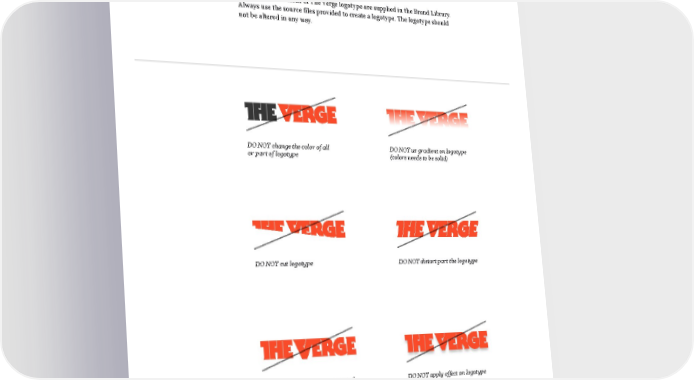 Logotype Visual Identity guidelines 1.03 Logotype Dos & Don’ts The correct variations of The Verge logotype are supplied in the Brand Library. Always use the source files provided to create a logotype. The logotype should not be altered in any way. DO NOT change the color of all DO NOT us gradient on logotype or part of logotype (colors needs to be solid) DO NOT cut logotype DO NOT distort part the logotype DO NOT change the proportion of DO NOT apply effect on logotype any part of logotype The Verge 7
