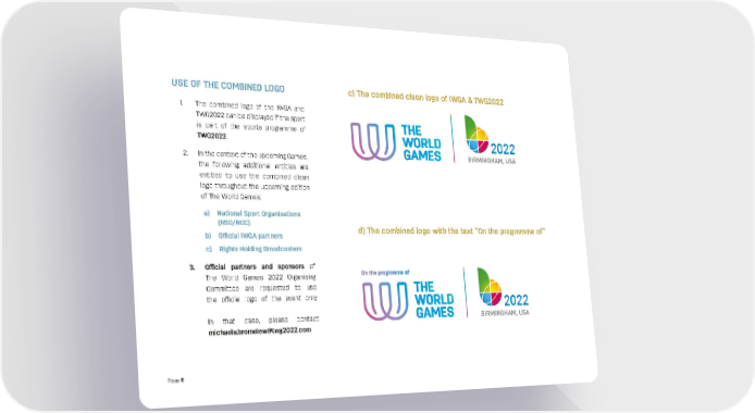 USE OF THE COMBINED LOGO c) The combined clean logo of IWGA & TWG2022 1. The combined logo of the IWGA and TWG2022 can be displayed if the sport is part of the sports programme of TWG2022. 2. In the context of the upcoming Games, the following additional entities are entitled to use the combined clean logo throughout the upcoming edition of The World Games: a) National Sport Organisations (NSO/NOC) b) Official IWGA partners d) The combined logo with the text “On the programme of” c) Rights Holding Broadcasters 3. Official partners and sponsors of The World Games 2022 Organising Committee are requested to use the official logo of the event only. In that case, please contact michaela.bromelow@twg2022.com Page 8