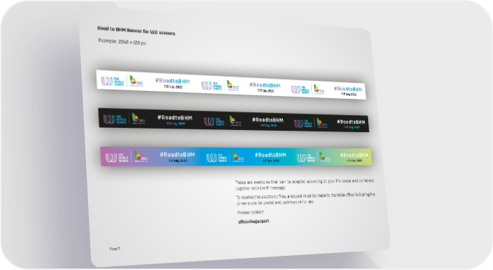Road to BHM Banner for LED screens Example: 2240 x 128 px These are examples that can be adapted according to your IF’s needs and combined together with the IF message. To receive the electronic files, a request must be made to the IWGA office indicating the dimensions (in pixels) and justification for use. Please contact [email protected] Page 11