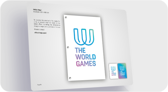 IWGA Flag 1 Example: 120 x 180 cm To receive the electronic file ready for print, a request must be made to the IWGA office indicating the dimensions (length x height) and justification for use. Please contact office@iwga.sport Page 13