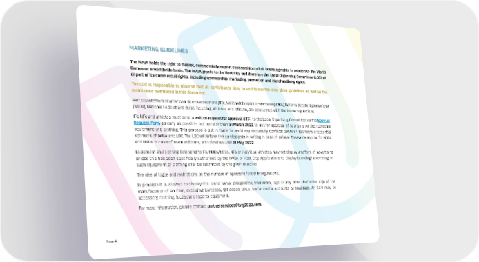 MARKETING GUIDELINES The IWGA holds the right to market, commercially exploit sponsorship and all licensing rights in relation to The World Games on a worldwide basis. The IWGA grants to the Host City and therefore the Local Organising Committee (LOC) all or part of its commercial rights, including sponsorship, marketing, promotion and merchandising rights. The LOC is responsible to observe that all participants obey to and follow the own given guidelines as well as the restrictions mentioned in this document. Participants from International Sport Federations (IFs), National Olympic Committees (NOCs), National Sports Organisations (NSOs), National Federations (NFs), including athletes and officials, are concerned with the below regulations. IFs, NFs and athletes must send a written request for approval (RFP) to the Local Organising Committee via the Sponsor Request Form as early as possible, but no later than 31 March 2022 to ask for approval of sponsors on their personal equipment and clothing. This process is put in place to avoid any exclusivity conflicts between sponsors or potential sponsors of IWGA and LOC. The LOC will inform the participants in writing in case of refusal. The same applies for NOCs and NSOs in case of team uniforms, with timeline until 31 May 2022. Equipment and clothing belonging to IFs, NOCs/NSOs, NFs or individual athletes may not display any form of advertising unless this has been specifically authorised by the IWGA or Host City. Applications to display branding/advertising on such equipment or clothing shall be submitted by the given deadline. The size of logos and restrictions on the number of sponsors follow IF regulations. In principle it is allowed to display the brand name, designation, trademark, logo or any other distinctive sign of the manufacturer of an item, excluding barcodes, QR codes, URLs, social media accounts or hashtags. An item may be accessory, clothing, footwear or sports equipment. For more information, please contact [email protected]. Page 4