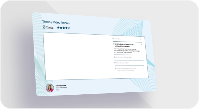 Theta / Video Review 01 Full Video 02What business problems are you solving with the product? Tara briefly outlines their focus on customer acquisition through content marketing campaigns and personalized sales proposals. 03What do you like the best? 04What do you dislike? 05What recommendations do you have for others considering? Tara Heptinstall Head of Marketing Theta