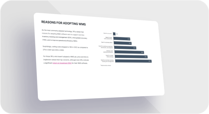 REASONS FOR ADOPTING WMS As the most commonly adopted technology, 3PLs stated their reasons for adopting WMS software were to support real-time inventory tracking and management (82%), drive greater accuracy (75%), and to improve operational efficiency (69%). Surprisingly, cutting costs dropped to 19% in 2022 as compared to 27% in 2021 and 33% in 2020. For those 3PLs who haven’t adopted a WMS yet, price and time to implement ranked their top concerns, although most 3PLs indicate a significant return on investment (ROI) for their WMS software. *Multiple selections allowed.