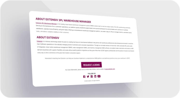 ABOUT EXTENSIV 3PL WAREHOUSE MANAGER Extensiv 3PL Warehouse Manager is the leading cloud-based warehouse management system (WMS) solution built to meet the unique needs of the 3PL warehousing community. Serving as the backbone of our customers’ operations, our platform quickly transforms paper-based, error-prone businesses into service leaders who can focus on customer satisfaction, operate more efficiently, and grow faster. Offering a comprehensive warehouse management platform, we make it easy for 3PLs to manage inventory, automate routine tasks, and deliver complete visibility to their customers. ABOUT EXTENSIV Extensiv is a visionary technology leader focused on creating the future of omnichannel fulfillment. We partner with warehouse professionals and entrepreneurial brands to transform their fulfillment operations in the radically changing world of commerce and consumer expectations. Through our unrivaled network of more than 1,500 connected 3PLs and a suite of integrated, cloud-native warehouse management (WMS), order management (OMS), and inventory management (IMS) software, we enable modern merchants and brands to fulfill demand anywhere with superior flexibility and scale without painful platform migrations as they grow. More than 25,000 logistics professionals and thousands of brands trust Extensiv every day to drive commerce at the pace that modern consumers expect. Interested in learning how Extensiv can help your business implement a comprehensive WMS platform and build best practices across your warehouse in 2023? REQUEST A DEMO For more information, please call us at 833-983-6748 or visit us online at www.extensiv.com. FOLLOW US © 2022 Extensiv I All rights reserved.