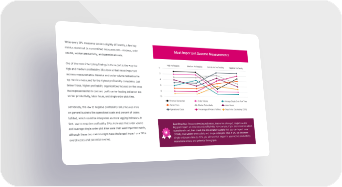 While every 3PL measures success slightly differently, a few key metrics stand out as conventional measurements—revenue, order volume, worker productivity, and operational costs. One of the more interesting findings in the report is the way that high and medium profitability 3PLs look at their most important success measurements. Revenue and order volume ranked as the top metrics measured for the highest profitability companies. Just below those, higher profitability organizations focused on the areas that represented both cost and profit center leading indicators like worker productivity, labor hours, and single order pick time. Conversely, the low to negative profitability 3PLs focused more on general buckets like operational costs and percent of orders fulfilled, which could be interpreted as more lagging indicators. In fact, low to negative profitability 3PLs indicated that order volume Best Practice: Focus on leading indicators, that when changed, might have the and average single order pick time were their least important metric, biggest impact on revenue and profitability. For example, if you are concerned about although these two metrics might have the largest impact on a 3PL’s operational cost, then break that into smaller buckets that you can impact more broadly, like worker productivity and single order pick time. If you can decrease overall costs and potential revenue. single order pick time by 15%, you will see that impact in your worker productivity, operational costs, and potential throughput.