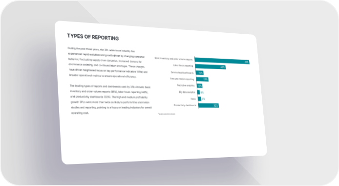 TYPES OF REPORTING During the past three years, the 3PL warehouse industry has experienced rapid evolution and growth driven by changing consumer behavior, fluctuating supply chain dynamics, increased demand for ecommerce ordering, and continued labor shortages. These changes have driven heightened focus on key performance indicators (KPIs) and broader operational metrics to ensure operational efficiency. The leading types of reports and dashboards used by 3PLs include: basic inventory and order volume reports (81%), labor hours reporting (46%), and productivity dashboards (32%). The high and medium profitability growth 3PLs were more than twice as likely to perform time and motion studies and reporting, pointing to a focus on leading indicators for overall operating cost. *Multiple selections allowed.