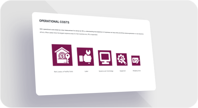 OPERATIONAL COSTS With operational costs listed as a key measurement for almost all 3PLs, understanding the breakdown of expenses can help when prioritizing revenue generation or cost reduction efforts. When asked what the largest expense areas for their business are, 3PLs responded: Rent, Lease, or Facility Costs Labor Systems and Technology Equipment Shipping Costs