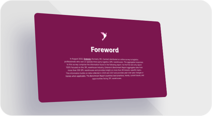 Foreword In August 2022, Extensiv (formerly 3PL Central) distributed an online survey to logistics professionals who own or operate third-party logistics (3PL) warehouses. The aggregated responses to this survey comprise the information found in the following report. As the first and only report 100% focused on the 3PL warehouse industry, Extensiv’s Benchmark Report aggregates data from more than 200 3PL warehouses and provides insight on more than 30 industry-specific topics. This information builds on data collected in 2020 and 2021 and provides year-over-year changes or trends when applicable. The Benchmark Report examines best practices, trends, current issues, and opportunities facing 3PL warehouses.