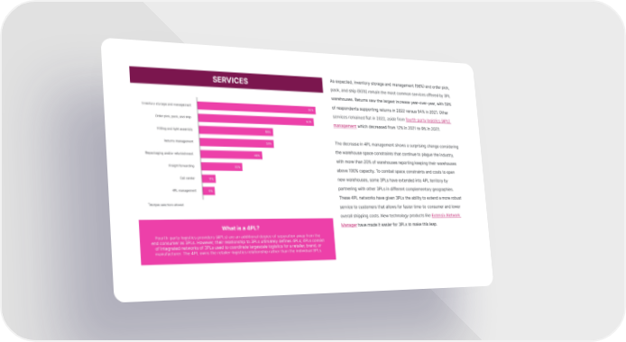 SERVICES As expected, inventory storage and management (96%) and order pick, pack, and ship (93%) remain the most common services offered by 3PL warehouses. Returns saw the largest increase year-over-year, with 59% of respondents supporting returns in 2022 versus 54% in 2021. Other services remained flat in 2022, aside from fourth-party logistics (4PL) management which decreased from 12% in 2021 to 9% in 2022. The decrease in 4PL management shows a surprising change considering the warehouse space constraints that continue to plague the industry, with more than 20% of warehouses reporting keeping their warehouses above 100% capacity. To combat space constraints and costs to open new warehouses, some 3PLs have extended into 4PL territory by partnering with other 3PLs in different complementary geographies. These 4PL networks have given 3PLs the ability to extend a more robust *Multiple selections allowed. service to customers that allows for faster time-to-consumer and lower overall shipping costs. New technology products like Extensiv Network What is a 4PL? Manager have made it easier for 3PLs to make this leap. Fourth-party logistics providers (4PLs) are an additional degree of separation away from the end consumer as 3PLs. However, their relationship to 3PLs ultimately defines 4PLs; 4PLs consist of integrated networks of 3PLs used to coordinate largescale logistics for a retailer, brand, or manufacturer. The 4PL owns the retailer-logistics relationship rather than the individual 3PLs.