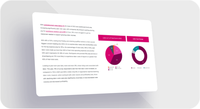 With unemployment rates below 4% for most of 2022 and warehouse hourly pay increasing significantly year-over-year, with companies like Amazon pushing starting pay for warehouse workers up to $19 an hour, 3PLs have struggled to get the manpower needed to support growing order volumes. With 48% of 3PLs stating that finding and retaining qualified workers is their second biggest concern heading into 2023, it’s no surprise labor nearly tied rent/facilities costs for the top expense area for 3PLs. As a percentage of total costs, 59% of 3PLs said labor costs made up more than 40% of their total operating expenses and another 33% said it represents 25-39% of costs. Participants who provide FBA prep services or dropshipping are 15% more likely to experience labor costs of equal to or greater than 40% of their total costs. Looking at year-over-year data, more and more 3PLs show rising costs associated with labor. This year, 79% of survey respondents said that their labor costs increased, as compared to 73% in 2021 and 59% in 2020. Only 6% of respondents reported declining labor costs; however, when overlayed with order volume and profitability data, those with declining labor costs were also significantly more likely to have decreased order volumes and decreased profitability.
