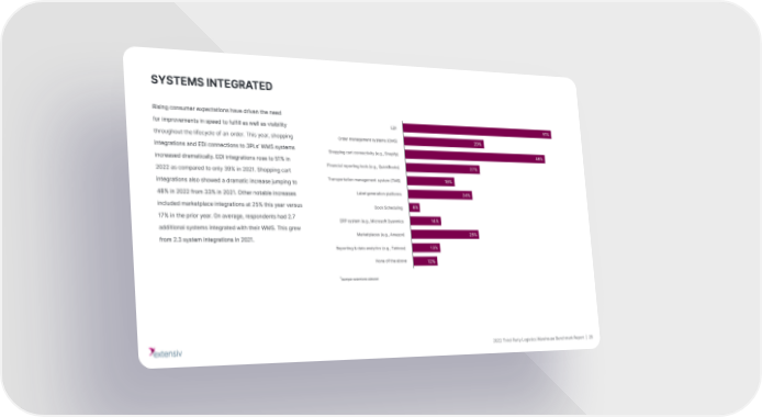 SYSTEMS INTEGRATED Rising consumer expectations have driven the need for improvements in speed to fulfill as well as visibility throughout the lifecycle of an order. This year, shopping integrations and EDI connections to 3PLs’ WMS systems increased dramatically. EDI integrations rose to 51% in 2022 as compared to only 39% in 2021. Shopping cart integrations also showed a dramatic increase jumping to 48% in 2022 from 33% in 2021. Other notable increases included marketplace integrations at 25% this year versus 17% in the prior year. On average, respondents had 2.7 additional systems integrated with their WMS. This grew from 2.3 system integrations in 2021. *Multiple selections allowed. 2022 Third-Party Logistics Warehouse Benchmark Report | 28