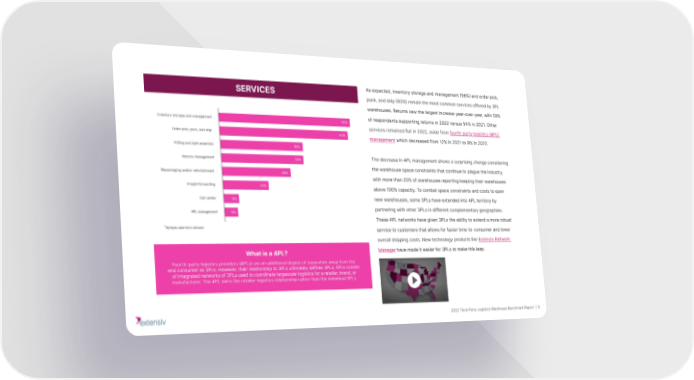 SERVICES As expected, inventory storage and management (96%) and order pick, pack, and ship (93%) remain the most common services offered by 3PL warehouses. Returns saw the largest increase year-over-year, with 59% of respondents supporting returns in 2022 versus 54% in 2021. Other services remained flat in 2022, aside from fourth-party logistics (4PL) management which decreased from 12% in 2021 to 9% in 2022. The decrease in 4PL management shows a surprising change considering the warehouse space constraints that continue to plague the industry, with more than 20% of warehouses reporting keeping their warehouses above 100% capacity. To combat space constraints and costs to open new warehouses, some 3PLs have extended into 4PL territory by partnering with other 3PLs in different complementary geographies. These 4PL networks have given 3PLs the ability to extend a more robust *Multiple selections allowed. service to customers that allows for faster time-to-consumer and lower overall shipping costs. New technology products like Extensiv Network What is a 4PL? Manager have made it easier for 3PLs to make this leap. Fourth-party logistics providers (4PLs) are an additional degree of separation away from the end consumer as 3PLs. However, their relationship to 3PLs ultimately defines 4PLs; 4PLs consist of integrated networks of 3PLs used to coordinate largescale logistics for a retailer, brand, or manufacturer. The 4PL owns the retailer-logistics relationship rather than the individual 3PLs. 2022 Third-Party Logistics Warehouse Benchmark Report | 8