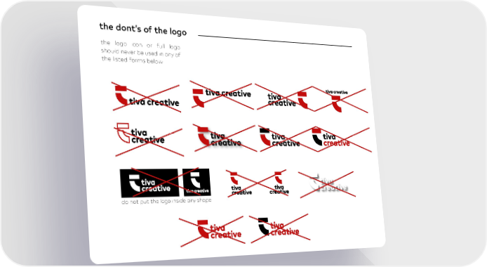 TIVA Creative Brand Book Page 10 Page 12the dont’s of the logo the logo icon or full logo should never be used in any of the listed forms below. do not put the logo inside any shape