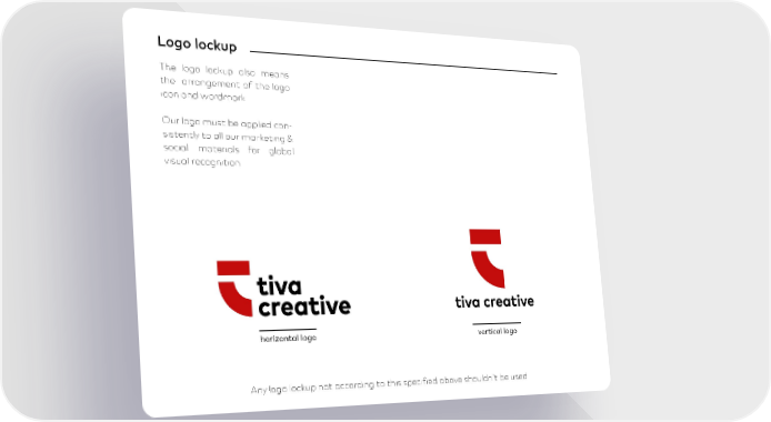 Logo lockup The logo lockup also means the arrangement of the logo icon and wordmark. Our logo must be applied con- sistently to all our marketing & social materials for global visual recognition. Any logo lockup not according to this specified above shouldn’t be used. horizontal logo vertical logo tiva creative