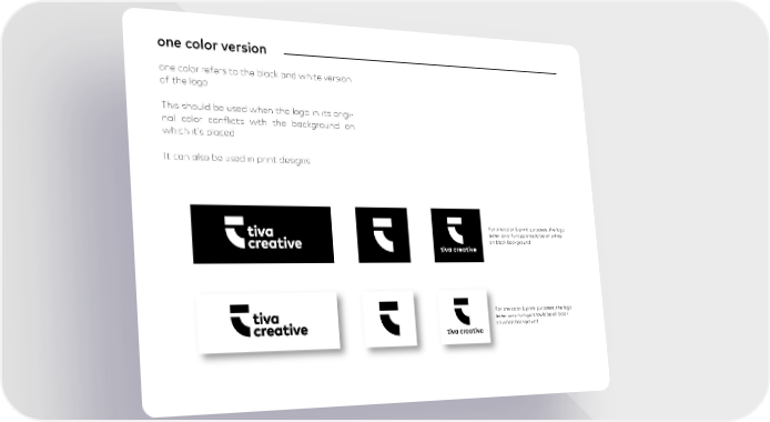 one color version one color refers to the black and white version of the logo. This should be used when the logo in its origi- nal color conflicts wth the background on which it’s placed. It can also be used in print designs tiva creative tiva creative For one color & print purposes, the logo (either icon or full logo) should be all white on black background For one color & print purposes, the logo (either icon or full logo) should be all black on white background
