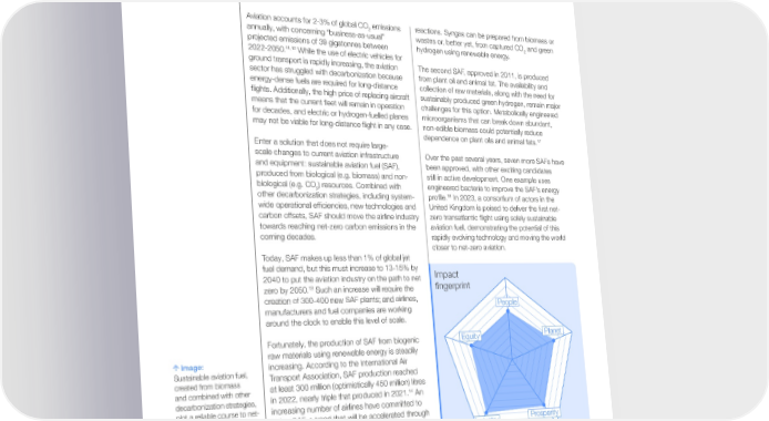 Mariette DiChristina Dean and Professor of the Practice in Journalism, Boston University College of Communication Lee Sang-Yup Senior Vice-President for Research, Korea Advanced Institute of Science and Technology Lauren Uppink Calderwood Head, Climate Strategy, Centre for Nature and Climate, World Economic Forum Aviation accounts for 2-3% of global CO emissions reactions. Syngas can be prepared from biomass or 2 annually, with concerning “business-as-usual” wastes or, better yet, from captured CO and green 2 projected emissions of 39 gigatonnes between hydrogen using renewable energy. 11,12 2022-2050. While the use of electric vehicles for ground transport is rapidly increasing, the aviation The second SAF, approved in 2011, is produced sector has struggled with decarbonization because from plant oil and animal fat. The availability and energy-dense fuels are required for long-distance collection of raw materials, along with the need for 昀氀ights. Additionally, the high price of replacing aircraft sustainably produced green hydrogen, remain major means that the current 昀氀eet will remain in operation challenges for this option. Metabolically engineered for decades, and electric or hydrogen-fuelled planes microorganisms that can break down abundant, may not be viable for long-distance 昀氀ight in any case. non-edible biomass could potentially reduce dependence on plant oils and animal fats.17 Enter a solution that does not require large- scale changes to current aviation infrastructure Over the past several years, seven more SAFs have and equipment: sustainable aviation fuel (SAF), been approved, with other exciting candidates produced from biological (e.g. biomass) and non- still in active development. One example uses biological (e.g. CO ) resources. Combined with engineered bacteria to improve the SAF’s energy 2 other decarbonization strategies, including system- 18 In 2023, a consortium of actors in the pro昀椀le. wide operational ef昀椀ciencies, new technologies and United Kingdom is poised to deliver the 昀椀rst net- carbon offsets, SAF should move the airline industry zero transatlantic 昀氀ight using solely sustainable towards reaching net-zero carbon emissions in the aviation fuel, demonstrating the potential of this coming decades. rapidly evolving technology and moving the world closer to net-zero aviation. Today, SAF makes up less than 1% of global jet fuel demand, but this must increase to 13-15% by Impact 2040 to put the aviation industry on the path to net 13 Such an increase will require the 昀椀ngerprint zero by 2050. creation of 300-400 new SAF plants; and airlines, People manufacturers and fuel companies are working around the clock to enable this level of scale. Fortunately, the production of SAF from biogenic Equity Planet raw materials using renewable energy is steadily Image: increasing. According to the International Air Sustainable aviation fuel, Transport Association, SAF production reached created from biomass at least 300 million (optimistically 450 million) litres and combined with other 14 An decarbonization strategies, in 2022, nearly triple that produced in 2021. plot a reliable course to net- increasing number of airlines have committed to zero aviation. using SAF, a trend that will be accelerated through Credit: Midjourney and global efforts such as the World Economic Forum’s Industry Prosperity 15 Studio Miko. Clean Skies for Tomorrow initiative and First Prompt (abbreviated): Movers Coalition. “Drops of fuel splashing The American Society of Testing and Materials in the shape of leaves”. (ASTM) has approved nine SAFs for blending at a Read more: ratio of up to 50% with conventional petroleum- 2-3% Discover expert analysis 16 The 昀椀rst SAF, approved by ASTM related to sustainable based jet fuel. of annual global CO aviation fuel on the in 2009, is produced by converting syngas (a 2 Strategic Intelligence mixture of carbon monoxide and hydrogen) emissions are from aviation Platform. into hydrocarbons through a series of chemical Top 10 Emerging Technologies of 2023 13