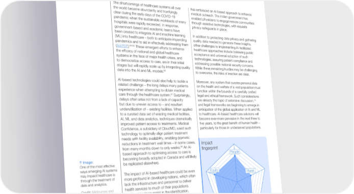 Daniel E. Hurtado Mine Orlu Associate Professor, Ponti昀椀cal Catholic Professor of Pharmaceutics, UCL School University of Chile of Pharmacy, Faculty of Life Sciences, UCL Andrew Maynard Landry Signe Professor of Advanced Technology Transitions, Senior Fellow, Brookings Institution Arizona State University Bernard S. Meyerson Chief Innovation Of昀椀cer Emeritus, IBM The shortcomings of healthcare systems all over has embraced an AI-based approach to enhance the world became abundantly and horrifyingly medical outreach. The Indian government has clear during the early days of the COVID-19 enabled physicians to engage remote communities pandemic when the sustainable workloads of many through assistive technologies, with requisite hospitals were rapidly exceeded. In response, privacy safeguards in place. government-based and academic teams have been created to integrate AI and machine learning In addition to protecting data privacy and gathering (ML) into healthcare – both to anticipate impending quality data needed to generate these insights, pandemics and to aid in effectively addressing them other challenges to implementing AI-facilitated 64,65 (AI4PEP). These emergent efforts to enhance healthcare approaches include bolstering public the ef昀椀cacy of national and global healthcare acceptance and universal adoption of such systems in the face of major health crises, and technologies, assuring patient compliance and to democratize access to care, are in their initial addressing possible national security concerns. stages but will rapidly scale up by integrating quality While these remaining hurdles may be challenging data into the AI and ML models.66 to overcome, the risks of inaction are clear. AI-based technologies could also help to tackle a Moreover, any system that curates personal data related challenge – the long delays many patients on the health and welfare of a vast population must experience when attempting to obtain medical function within the bounds of a carefully crafted care through the healthcare system.67 Surprisingly, legal and ethical framework. Such considerations delays often arise not from a lack of capacity 70 are already the topic of extensive discussion, but due to uneven access to – and resultant and legal frameworks are beginning to emerge in underutilization of – existing facilities. When applied anticipation of the global application of AI and ML to a curated data set of existing medical facilities, to healthcare. AI-based healthcare solutions will AI, ML and data analytics, techniques dramatically become ever-more pervasive in the next three to improved patient access to treatments. Medical 昀椀ve years, to the great bene昀椀t of human health – Con昀椀dence, a subsidiary of CloudMD, used such particularly for those in underserved populations. technology to optimally align patient treatment needs with facility availability, enabling dramatic reductions in treatment wait times – in some cases, Impact 68 An AI- from many months down to only weeks. 昀椀ngerprint based approach to optimizing access to care is People Image: becoming broadly adopted in Canada and will likely One of the most effective be replicated elsewhere. ways emerging AI systems may impact healthcare is The impact of AI-based healthcare could be even Equity Planet through the treatment of more profound in developing nations, which often data and analytics. lack the infrastructure and personnel to deliver Credit: Midjourney and health services to much of their populations. Studio Miko. Intelligent tools to assist in the identi昀椀cation, Prompt (abbreviated): monitoring and treatment of new or ongoing “Abstract population data”. medical conditions – such as an AI-based system 69 Read more: to facilitate the reading of radiological data – are Discover expert analysis a 昀椀rst step in leveraging AI and ML to enhance related to AI-facilitated healthcare capabilities in locations where care is Prosperity healthcare on the Strategic currently inadequate. India, for example, has a Industry Intelligence Platform. widely dispersed population of over 1.4 billion and Top 10 Emerging Technologies of 2023 27