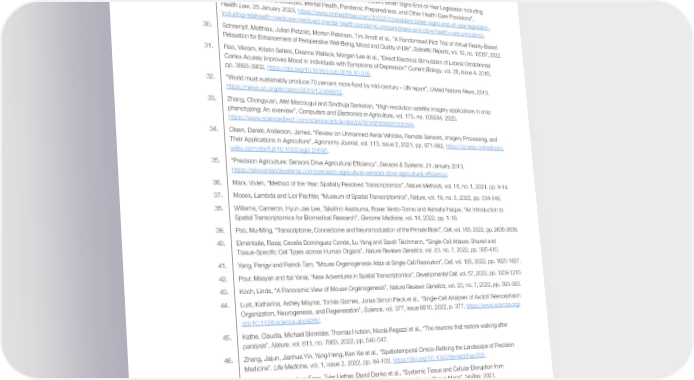 25. Twenge, Jean and W. Keith Campbell, “Associations Between Screen Time and Lower Psychological Well-Being Among Children and Adolescents: Evidence from a Population-Based Study”, Science Direct, vol. 12, 2018, https://www.sciencedirect.com/science/article/pii/S2211335518301827. 26. “Screen Time Can Be a Lifeline…” Family Zone, n.d., https://www.familyzone.com/anz/families/blog/screen-time-can-be-a-lifeline. 27. Becerra, Xavier, Andrea Palm, Rebecca Haffajee, January Contreras et al., “Addressing the Nation’s Behavioral Health Crisis: An HHS Roadmap to Integrate Behavioral Health”, Health Affairs Forefront, 2 December 2022, https://www.healthaffairs. org/content/forefront/addressing-nations-behavioral-health-crisis-hhs-roadmap-integrate-behavioral-health. 28. Weiner, Stacy, “A Growing Psychiatrist Shortage and an Enormous Demand for Mental Health Services”, American Association of Medical Colleges, 9 August 2022, https://www.aamc.org/news-insights/growing-psychiatrist- shortage-enormous-demand-mental-health-services. 29. Barsky, Troy, Jodi Daniel, Stacie Heller and Allison Kwon, “President Biden Signs End-of-Year Legislation Including Telehealth, Medicare & Medicaid, Mental Health, Pandemic Preparedness, and Other Health Care Provisions”, Health Law, 25 January 2023, https://www.cmhealthlaw.com/2023/01/president-biden-signs-end-of-year-legislation- including-telehealth-medicare-medicaid-mental-health-pandemic-preparedness-and-other-health-care-provisions/. 30. Schrempf, Matthias, Julian Petzold, Morten Petersen, Tim Arndt et al., “A Randomised Pilot Trial of Virtual Reality-Based Relaxation for Enhancement of Perioperative Well-Being, Mood and Quality of Life”, Scienti昀椀c Reports, vol. 12, no. 12067, 2022. 31. Rao, Vikram, Kristin Sellers, Deanna Wallace, Morgan Lee et al., “Direct Electrical Stimulation of Lateral Orbitofrontal Cortex Acutely Improves Mood in Individuals with Symptoms of Depression” Current Biology, vol. 28, issue 4, 2018, pp. 3893-3902, https://doi.org/10.1016/j.cub.2018.10.026. 32. “World must sustainably produce 70 percent more food by mid-century – UN report”, United Nations News, 2013, https://news.un.org/en/story/2013/12/456912. 33. Zhang, Chongyuan, Afef Marzougui and Sindhuja Sankaran, “High-resolution satellite imagery applications in crop phenotyping: An overview”, Computers and Electronics in Agriculture, vol. 175, no. 105584, 2020, https://www.sciencedirect.com/science/article/abs/pii/S0168169920309194. 34. Olsen, Daniel; Anderson, James. “Review on Unmanned Aerial Vehicles, Remote Sensors, Imagery Processing, and Their Applications in Agriculture”, Agronomy Journal, vol. 113, issue 2, 2021, pp. 971-992, https://acsess.onlinelibrary. wiley.com/doi/full/10.1002/agj2.20595. 35. “Precision Agriculture: Sensors Drive Agricultural Ef昀椀ciency”, Sensors & Systems, 21 January 2013, https://sensorsandsystems.com/precision-agriculture-sensors-drive-agricultural-ef昀椀ciency/. 36. Marx, Vivien, “Method of the Year: Spatially Resolved Transcriptomics”, Nature Methods, vol. 18, no. 1, 2021, pp. 9-14. 37. Moses, Lambda and Lior Pachter, “Museum of Spatial Transcriptomics”, Nature, vol. 19, no. 5, 2022, pp. 534-546. 38. Williams, Cameron, Hyun Jae Lee, Takahiro Asatsuma, Roser Vento-Tormo and Ashraful Haque, “An Introduction to Spatial Transcriptomics for Biomedical Research”, Genome Medicine, vol. 14, 2022, pp. 1-18. 39. Poo, Mu-Ming, “Transcriptome, Connectome and Neuromodulation of the Primate Brain”, Cell, vol. 185, 2022, pp. 2636-2639. 40. Elmentaite, Rasa; Cecelia Domínguez Conde, Lu Yang and Sarah Teichmann, “Single-Cell Atlases: Shared and Tissue-Speci昀椀c Cell Types across Human Organs”, Nature Reviews Genetics, vol. 23, no. 7, 2022, pp. 395-410. 41. Yang, Pengyi and Patrick Tam, “Mouse Organogenesis Atlas at Single-Cell Resolution”, Cell, vol. 185, 2022, pp. 1625-1627. 42. Pour, Maayan and Itai Yanai, “New Adventures in Spatial Transcriptomics”, Developmental Cell, vol. 57, 2022, pp. 1209-1210. 43. Koch, Linda, “A Panoramic View of Mouse Organogenesis”, Nature Reviews Genetics, vol. 23, no. 7, 2022, pp. 393-393. 44. Lust, Katharina, Ashley Maynar, Tomás Gomes, Jonas Simon Fleck et al., “Single-Cell Analyses of Axolotl Telencephalon Organization, Neurogenesis, and Regeneration”, Science, vol. 377, issue 6610, 2022, p. 377, https://www.science.org/ doi/10.1126/science.abp9262. 45. Kathe, Claudia, Michael Skinnider, Thomas Hutson, Nicola Regazzi et al., “The neurons that restore walking after paralysis”, Nature, vol. 611, no. 7963, 2022, pp. 540-547. 46. Zhang, Jiajun, Jianhua Yin, Yang Heng, Ken Xie et al., “Spatiotemporal Omics–Re昀椀ning the Landscape of Precision Medicine”, Life Medicine, vol. 1, issue 2, 2022, pp. 84-102, https://doi.org/10.1093/lifemedi/lnac053. 47. Park, Jiwoon, Jonathan Foox, Tyler Hether, David Danko et al., “Systemic Tissue and Cellular Disruption from SARS-CoV-2 Infection Revealed in COVID-19 Autopsies and Spatial Omics Tissue Maps”, bioRxiv, 2021, https://doi.org/10.1101/2021.03.08.434433. 48. “Spatial Omics Solutions Market Worth $587.2 Million by 2030 - Exclusive Report by InsightAce Analytic”, InsightAce Analytic, 10 August 2022, https://www.prnewswire.com/news-releases/spatial-omics-solutions-market-worth-587-2- million-by-2030---exclusive-report-by-insightace-analytic-301603401.html. 49. Grand View Research, Spatial OMICS Market Size, Share & Trends Analysis Report by Technology (Transcriptomics, Genomics, Proteomics), by Product, by Work昀氀ow, by Sample Type, by End Use, by Region, and Segment Forecasts, 2021–2028, n.d., https://www.grandviewresearch.com/industry-analysis/spatial-omics-market. 50. Marx, Vivien, “Method of the Year: Spatially Resolved Transcriptomics”, Nature Methods, vol. 18, no. 1, 2021, pp. 9-14. Top 10 Emerging Technologies of 2023 33