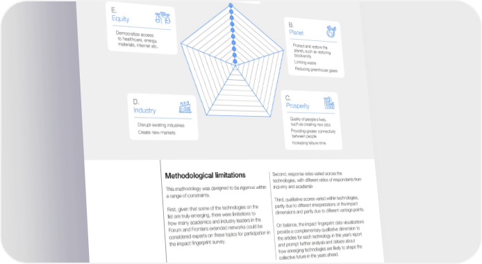 FIGURE 1 “Impact 昀椀ngerprint” radar chart A. People – Security and dignity such as food security – Access to clean water – Improved healthcare outcomes 10 9 E. 8 B. Equity 7 Planet 6 5 – Democratize access 4 – Protect and restore the to healthcare, energy, 3 planet, such as restoring materials, internet etc. biodiversity 2 – Limiting waste 1 – Reducing greenhouse gases C. D. Prosperity Industry – Quality of people’s lives, – Disrupt existing industries such as creating new jobs – Create new markets – Providing greater connectivity between people – Increasing leisure time Second, response rates varied across the Methodological limitations technologies, with different ratios of respondents from This methodology was designed to be rigorous within industry and academia. a range of constraints. Third, qualitative scores varied within technologies, First, given that some of the technologies on the partly due to different interpretations of the impact list are truly emerging, there were limitations to dimensions and partly due to different vantage points. how many academics and industry leaders in the Forum and Frontiers extended networks could be On balance, the impact 昀椀ngerprint data visualizations considered experts on these topics for participation in provide a complementary qualitative dimension to the impact 昀椀ngerprint survey. the articles for each technology in this year’s report and prompt further analysis and debate about how emerging technologies are likely to shape the collective future in the years ahead. Top 10 Emerging Technologies of 2023 6