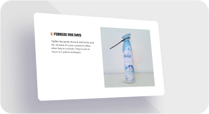 5. FEBREZE FOR DAYS Tighten the zip-tie, throw it, and run for your life. Or, leave it in your coworker's office when they're on break. They're sure to return to a potent workspace.