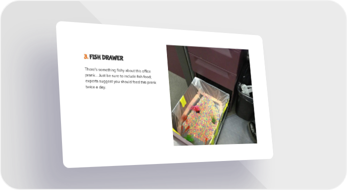 Top 10 Office Pranks Page 3 Page 53. FISH DRAWER There's something fishy about this office prank... Just be sure to include fish food; experts suggest you should feed this prank twice a day.