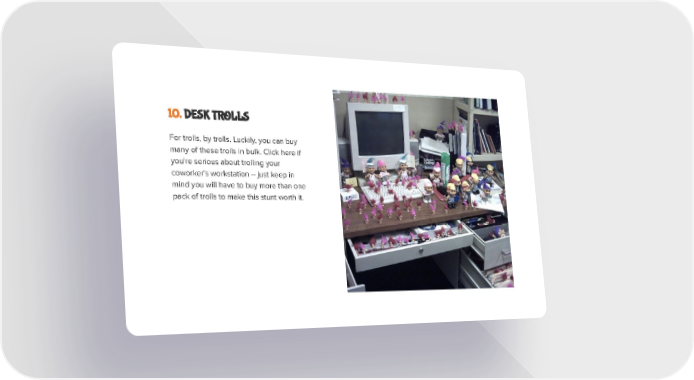 10. DESK TROLLS For trolls, by trolls. Luckily, you can buy many of these trolls in bulk. Click here if you're serious about trolling your coworker's workstation -- just keep in mind you will have to buy more than one pack of trolls to make this stunt worth it.