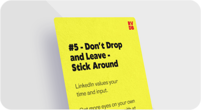 RV DB #5 - Don’t Drop and Leave - Stick Around LinkedIn values your time and input. Get more eyes on your own content by engaging with at least 3 - 4 posts directly after you have published yours.