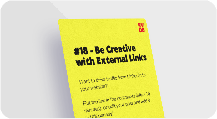 RV DB #18 - Be Creative with External Links Want to drive traffic from LinkedIn to your website? Put the link in the comments (after 10 minutes), or edit your post and add it (-10% penalty). Or just be brave and include it in the original post using the 6 ingredients for a Perfect Post (see Tip #9)