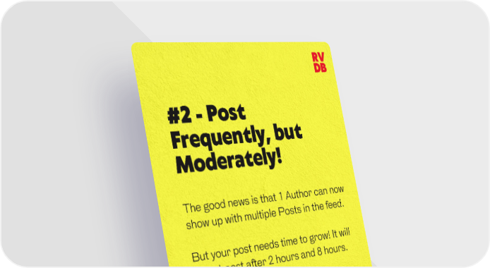 RV DB #2 - Post Frequently, but Moderately! The good news is that 1 Author can now show up with multiple Posts in the feed. But your post needs time to grow! It will get a boost after 2 hours and 8 hours. Don’t post within 18 hours from your last, since you will cannibalize your average reach per post.