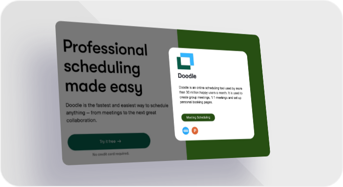 Doodle Doodle is an online scheduling tool used by more than 30 million happy users a month. It is used to create group meetings, 1:1 meetings and set up personal booking pages. Meeting Scheduling