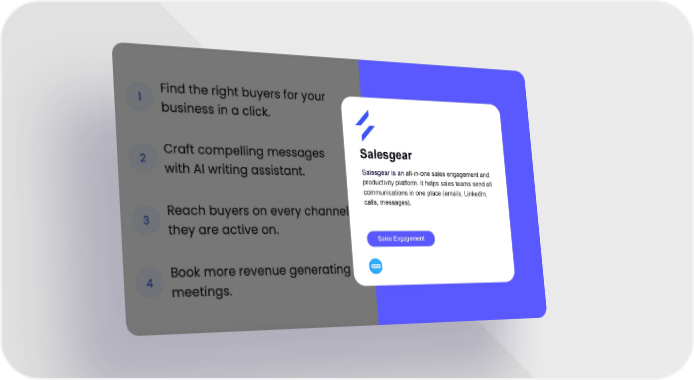Salesgear Salesgear is an all-in-one sales engagement and productivity platform. it helps sales teams send all communications in one place (emails, LinkedIn, calls, messages). Sales Engagement