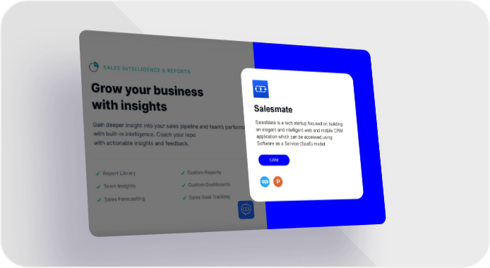 Salesmate SalesMate is a tech startup focused on building an elegant and intelligent web and mobile CRM application which can be accessed using Software as a Service (SaaS) model. CRM