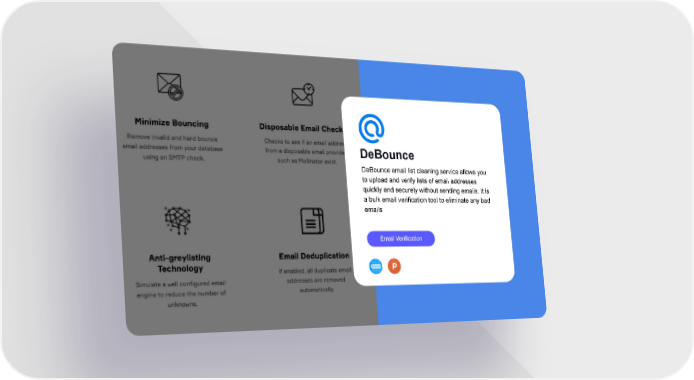 DeBounce DeBounce email list cleaning service allows you to upload and verify lists of email addresses quickly and securely without sending emails. It is a bulk email verification tool to eliminate any bad emails Email Verification