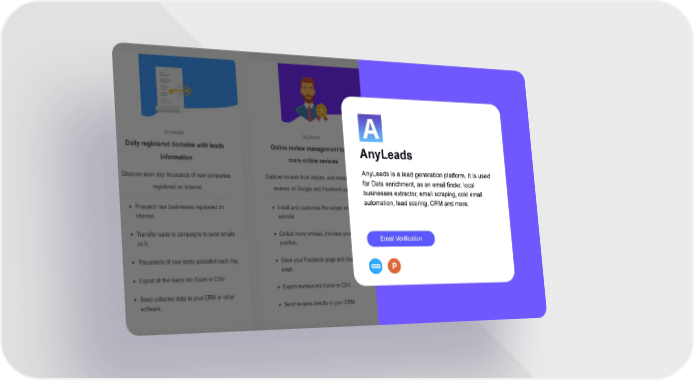 AnyLeads AnyLeads is a lead generation platform. It is used for Data enrichment, as an email finder, local businesses extractor, email scraping, cold email automation, lead scoring, CRM and more. Email Verification