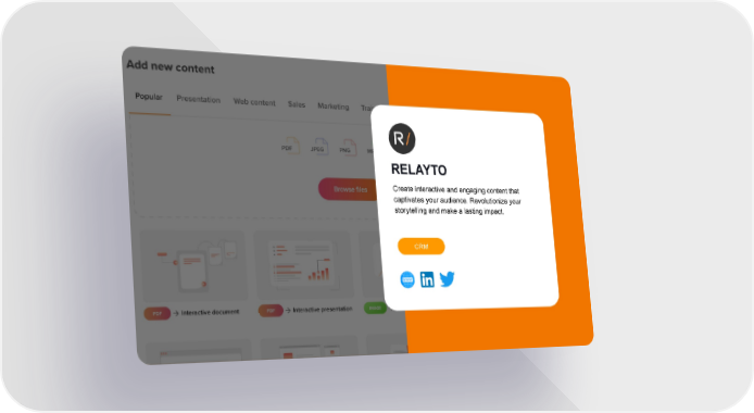 Top Sales Tools to Boost Your Revenue and Streamline Your Process Page 2 Page 4RELAYTO Create interactive and engaging content that captivates your audience. Revolutionize your storytelling and make a lasting impact. CRM