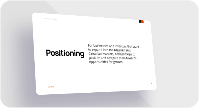 © 2020 Kishi Creative Agency For businesses and investors that want to expand into the Nigerian and Positioning Canadian markets, Torlago helps to position and navigate them towards opportunities for growth. OUR BRAND 06
