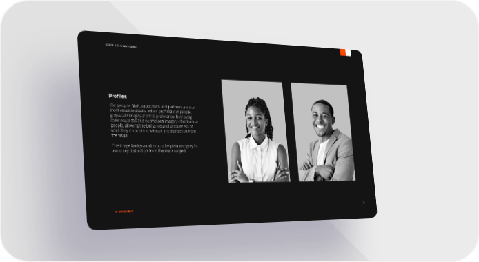 © 2020 Kishi Creative Agency Profiles Our people- Staff, supporters and partners are our most valuable assets. When profiling our people, grey-scale images are first preference. Removing color equalizes and normalizes imagery of individual people, allowing the brilliance and uniqueness of what they do to shine without any distraction from the visual The image background should be plain and grey to avoid any distraction from the main subject. 31 PHOTOGRAPHY 32