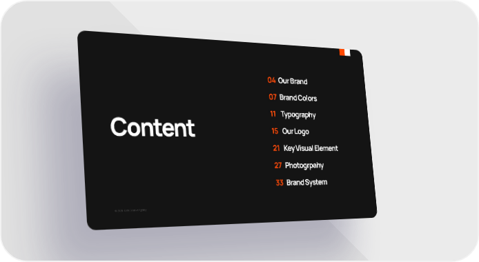 04 Our Brand 07 Brand Colors 11 Typography Content 15 Our Logo 21 Key Visual Element 27 Photogrpahy 33 Brand System © 2020 Kishi Creative Agency