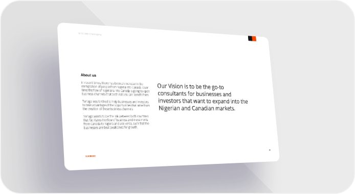 © 2020 Kishi Creative Agency About us In recent times, there has been an increase in the Our Vision is to be the go-to immigration of people from Nigeria into Canada. Over time the flow of Nigerians into Canada is going to open consultants for businesses and business channels that both nations can benefit from. Torlago was birthed to help businesses and investors investors that want to expand into the to take advantage of the opportunities that arise from Nigerian and Canadian markets. the creation of these business channels . Torlago wants to be the link between both countries that facilitates the flow of business and investments from Canada to Nigeria and vice versa, such that the 04 businesses are best positioned for growth. OUR BRAND 05