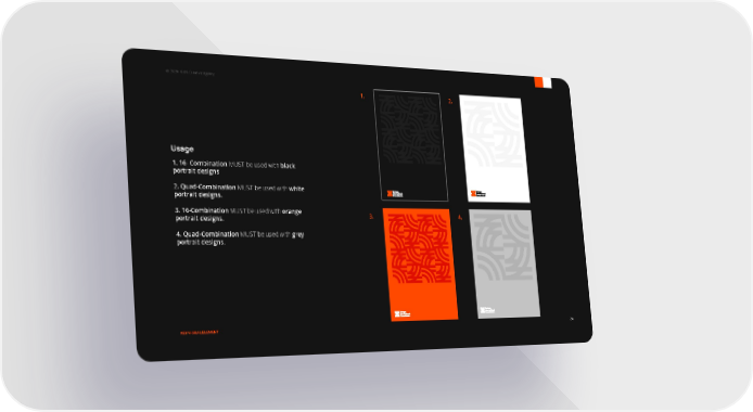 © 2020 Kishi Creative Agency 1. 2. Usage 1. 16- Combination MUST be used with black portrait designs 2. Quad-Combination MUST be used with white portrait designs. 3. 16-Combination MUST be used with orange 3. 4. portrait designs. 4. Quad-Combination MUST be used with grey portrait designs. KEY VISUAL ELEMENT 2423
