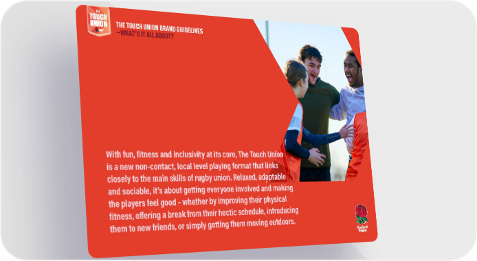 STANDARD LOGO WITH LIGHT KEYLINE – MAIN LOGO STANDARD LOGO WITH ORANGE KEYLINE SECONDARY LOGO THE THE THE THE THE TOUCH UNION BRAND GUIDELINES —WHAT’S IT ALL ABOUT? LOGO WITH STRAP – LIGHT KEYLINE LOGO WITH STRAP – LIGHT KEYLINE SECONDARY LOGO WITH STRAP THE THE THE THE WELCOME TO THE SQUAD NON-CONTACT. TOTAL FEEL GOOD WELCOME TO THE SQUAD WELCOME TO THE SQUAD LOGO WITH STRAP – ORANGE KEYLINE LOGO WITH STRAP – ORANGE KEYLINE THE THE With fun, fitness and inclusivity at its core, The Touch Union NON-CONTACT. TOTAL FEEL GOOD is a new non-contact, local level playing format that links WELCOME TO THE SQUAD closely to the main skills of rugby union. Relaxed, adaptable and sociable, it’s about getting everyone involved and making the players feel good – whether by improving their physical fitness, offering a break from their hectic schedule, introducing them to new friends, or simply getting them moving outdoors.