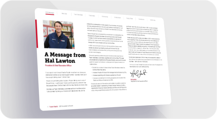 CEO Message Overview Team Members Customers Community Environment Supply Chain Governance SASB Index 1 Tractor Supply 2021 Sustainability Report A Message from Hal Lawton President & Chief Executive Officer If you spend much time at Tractor Supply—whether in our stores, our distribution centers or our store support center —sooner or later you’ll hear people talking about “Life Out Here.” They’re not just talking about a place. They’re talking about a way of life and living – a self-reliant lifestyle and the genuine, authentic way that people share “Life Out Here” with families, friends and loved ones. We help our Team Members, customers and communities pursue “Life Out Here” by living our Mission and Values every day, and by embedding sustainability in every aspect of our business. We believe we have a responsibility to live up to and maintain sustainability in all areas–from the way we treat our 46,000 Team Members to the way we tread lightly on the land. Tractor Supply has a longstanding commitment to sustainability. Our Stewardship Program has been an evolving journey over the past 14 years, in which we have viewed sustainability as a process of continuous improvement, driving positive environmental and social change within our company and our communities. In 2021, we continued to focus on driving positive change, most notably by advancing diversity, equity and inclusion for our team members and communities, and by announcing bold new environmental targets. We aim to provide a welcoming and inclusive environment for our Team Members, customers, suppliers and communities. This year, we established comprehensive five-year diversity, equity and inclusion goals to support and advance underrepresented groups across our stakeholders: • Double the number of stores where Team Members mirror the communities they serve, • Increase People of Color at the manager level and above by 50%, • Increase spending with diverse suppliers by 35% and • Increase commitment to funding programs and education for Black and African Americans by 30%. We are also proud of the actions we’ve taken to position ourselves as a retail leader in addressing climate change, helping to build a regenerative future by helping farmers, ranchers, and all those who enjoy living a rural lifestyle across the US succeed in their efforts to positively impact the land, air and water. In 2021 we set our boldest targets yet: committing to net zero emissions by 2040. To meet this goal, we will continue to increase our renewable energy use, invest in cleaner technologies, and design both our stores and distribution centers to maximize energy efficiency. While we’re proud of the steps we’ve taken in 2021, we recognize that this is a journey. That’s why we are establishing a new water goal of reducing our company-wide absolute water footprint by 25 million gallons by 2025. Tractor Supply firmly believes in the importance of managing water sustainably and putting in the forethought and effor t to build a better tomorrow for Life Out Here. This new goal is a key milestone in our sustainable journey, and is another reflection of our core Mission and Values coming to life and commitment to doing the right thing for our customers and the communities we call home. We are passionate about Life Out Here, and we respectfully take on the duties and obligations that are required to truly be Stewards of Life Out Here – both now and in the future. I invite you to read through this report and learn about the progress we have made on our sustainability journey. Hal Lawton President & Chief Executive Officer