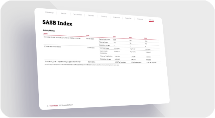 CEO Message Overview Team Members Customers Community Environment Supply Chain Governance SASB Index 44 Tractor Supply 2021 Sustainability Report SASB Index Activity Metrics Metric Code 2021 2020 2019 (1) number of retail locations (2) number of distribution centers CG-MR-000.A Tractor Supply Stores 2,003 1,923 1,844 Petsense Stores 178 182 180 Distribution Centers 8 8 8 (1) total area of retail space CG-MR-000.B Total Retail space 47,910,943 47,374,987 44,126,837 Tractor Supply Total Building 46,848,137 46,240,499 43,006,672 Petsense Total Building 1,062,806 1,134,488 1,120,165 Distribution Centers 6,062,263 6,062,263 6,062,263 Number of (1) Tier 1 suppliers and (2) suppliers beyond Tier 1 CG-AA-000.A 1,870 Tier 1 suppliers 1,764 Tier 1 suppliers 1,730 Tier 1 suppliers Square footage of retail space is the size of the total rentable area; the square footage of the entire building including sales floor, core areas, receiving area and excess space.