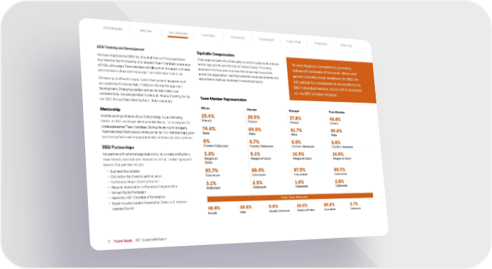 CEO Message Overview Team Members Customers Community Environment Supply Chain Governance SASB Index 17 Tractor Supply 2021 Sustainability Report DE&I Training and Development We have implemented DE&I training at all levels of the organization. Our intention for this training is to broaden Team Members’ awareness of DE&I, encourage Team Members to take action to support a diverse and inclusive culture and encourage Team Members to be allies. DEI training is offered in many Talent Development programs such as Leadership Fundamentals, Distribution Center Management Development, Emerging Leaders and as we teach about our competencies. We also provided Conscious Inclusion training during our 2021 Annual Sales Meeting for all store managers. Mentorship Another exciting initiative of our DE&I strategy is our Mentoring Circles. In 2021, we began piloting our Mentoring Circles program for underrepresented Team Members. During the six-month program, Team Members from various levels are led by VPs. Mentees learn, grow and develop from each engagement with mentors and other mentees. DE&I Partnerships We partner with external organizations to help create and foster a more diverse, equitable and inclusive culture at Tractor Supply and beyond. Our partners include: • Business Roundtable • CEO Action for Diversity and Inclusion • Conference Board Diversity Council • Hispanic Association on Corporate Responsibility • Human Rights Campaign • Nashville LGBT Chamber of Commerce • Retail Industry Leaders Association Diversity & Inclusion Leaders Council Equitable Compensation Every year we work with a third party to conduct a pay equity analysis across age, gender and ethnicity at Tractor Supply. This survey assesses individual jobs to ensure that we are paying equitably across the organization. Identified potential issues are reviewed and adjustments made as necessary to ensure pay equity. Team Member Representation Officer Director Manager Team Member 25.4% Female 29.5% Female 37.8% Female 49.8% Female 74.6% Male 69.8% Male 61.7% Male 49.6% Male 0% Gender Unknown 0.7% Gender Unknown 0.5% Gender Unknown 0.6% Gender Unknown 3.2% People of Color 9.1% People of Color 10.9% People of Color 16.9% People of Color 93.7% Caucasian 88.4% Caucasian 87.5% Caucasian 80.3% Caucasian 3.1% Unknown 2.5% Unknown 1.6% Unknown 2.8% Unknown Total Team Members 48.8% Female 50.6% Male 0.6% Gender Unknown 16.5% People of Color 80.8% Caucasian 2.7% Unknown Tractor Supply is committed to providing enhanced disclosure of the racial, ethnic and gender diversity of our workforce. In 2022, we will publish the breakdown of our workforce by EEO-1 standard metrics, which will be disclosed on our ESG Investor webpage.