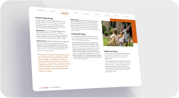 CEO Message Overview Team Members Customers Community Environment Supply Chain Governance SASB Index 18 Tractor Supply 2021 Sustainability Report Customer Inclusion Strategy Our DE&I Strategy for Customers states that we will know and celebrate our diverse customers and create a welcoming and inclusive experience. We continue to celebrate our diverse customers and create a welcoming and inclusive experience. In 2021, we focused on the following initiatives: Market Research: In 2021, we completed market research on African Americans, Hispanics and LGBTQ+ customers. The research has allowed us to better understand our customers while creating the opportunity to partner with our TMEGs to make our in-store culture more welcoming and reach more customers. Customer Promise: The DE&I Council created a Customer Promise to show our commitment to serving diverse customers and providing an inclusive shopping experience. We promise to treat everyone with respect, creating a welcoming environment where all are equal. In 2021, we began placing the Customer Promise statement in our stores. It states... “ We all share a love for Life Out Here and caring for our family, animals, community and land. Tractor Supply is committed to serving you and your community by creating an inclusive shopping experience where our doors are open to all. Our promise is to treat everyone with respect, creating a welcoming environment where all are equal.” Marketing Toolkit: We developed a Diversity Marketing Toolkit for our stores and distribution centers to use to foster engagement between Team Members and communities. The kits teach young people to grow vegetables at home in a Tractor Supply bucket or even grow gardens in their community. Through these toolkits, Tractor Supply is playing a role in educating youth while amplifying our DE&I initiatives. Community DE&I Strategy Our DE&I Strategy for Communities states that we will foster meaningful relationships with diverse community partners and invest in the communities we call home. In 2021, Tractor Supply donated more than $570,000 to DE&I causes, benefitting veterans, persons with disabilities, LGBTQ+ youth, Hispanic Team Members, women and Black and African Americans. Programs spanned a variety of initiatives, including working with Operation Stand Down Tennessee to support career transitions for veterans, Minorities in Agriculture, Natural Resources and Related Sciences (MANRRS) on youth education, NAACP Legal Defense Fund to support legal advocacy, Brentwood Inclusive Playground on accessibility and 100 Black Men of Middle Tennessee on civic engagement. Supplier Diversity Strategy Our DE&I Strategy for Supplier Diversity states that we will partner with certified diverse suppliers who can meet our customers’ needs by providing legendary service and great products at everyday low prices. This year we began developing our supplier diversity program by appointing an initiative owner and establishing a supplier diversity committee. To date, the committee has measured our current supplier diversity partnership and spend. The next step is to develop a strategy to increase our supplier diversity partnerships and spend year-over-year to meet our goal of 35% increase in diverse supplier spending.