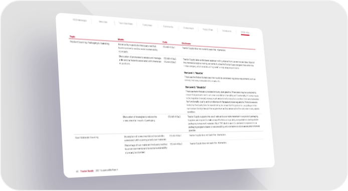 CEO Message Overview Team Members Customers Community Environment Supply Chain Governance SASB Index 49 Tractor Supply 2021 Sustainability Report Topic Metric Code Disclosure Product Sourcing, Packaging & Marketing Revenue from products third-party certified to environmental and/or social sustainability standards CG-MR-410a.1 Tractor Supply does not currently track this information. Discussion of processes to assess and manage risks and/or hazards associated with chemicals in products CG-MR-410a.2 CG-AA-250a.2 Tractor Supply takes a risk-based approach with guidance from our service providers. Most of the chemical analytical testing we conduct under the Tractor Supply program falls within the 1-star category, which includes all “high risk” or regulatory requirements: Star Level 1: “Must Do” These are the federal & state laws that would be considered regulatory requirements such as CPSIA, CFR tests, tests related to recalls, etc. Star Level 2: “Should Do” These are tests that are considered industry best practice. These tests may be conducted to ensure that products meet customer expectations for safety and functionality. If Tractor Supply is the importer of record, we require all products to be tested at a certified third-party laboratory for functionality, quality and compliance with federal and state regulations. Products are also tested by third-party labs for transit testing to ensure that the product in our packaged state can sustain the trip through the supply chain and be presented to the customer in safe, salable condition. Discussion of strategies to reduce the environmental impact of packaging CG-MR-410a.3 Tractor Supply supports the use of safe and sustainable materials in our product packaging. Suppliers are required to make every effort to use recyclable, compostable or biodegradable packaging component materials. Rigid PVC plastics are not a preferred component in our packaging programs based on recoverability, and alternative solutions are required whenever possible Raw Materials Sourcing Description of environmental and social risks associated with sourcing priority raw materials CG-AA-440a.1 Tractor Supply does not track this information. Percentage of raw materials third-party certified to an environmental and/or social sustainability standard, by standard CG-AA-440a.2 Tractor Supply does not track this information.