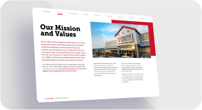 CEO Message Overview Team Members Customers Community Environment Supply Chain Governance SASB Index 4 Tractor Supply 2021 Sustainability Report Our Mission and Values Back in 1938, Tractor Supply’s founders started a mail-order catalog that turned into the kind of store they themselves would like to patronize. A store stocked with quality products and everyday low prices. Products that were not only a good value, but that suited their rural lifestyle. Along the way, they showed their respect for the land by treading on it lightly. And they showed their respect for each other by treating folks the way they would want to be treated. Soon it became clear that the growing group of stores needed to define what it stood for. The early leaders crafted a mission statement that would guide their young store like a north star: Work hard, have fun and make money by providing legendary service and great products at everyday low prices. Today we support this Mission with ten Values— ethics, respect, balance, winning attitude, communication, development, teamwork, change, initiative and accountability. These values drive every business decision we make and guide the way we interact with our Team Members and customers. Driven by our commitment to our company’s Mission and Values, we continue to execute on our purpose-driven ESG efforts by evaluating and implementing policies, programs and projects that benefit all stakeholders. Our Mission and Values are the “secret sauce” to our success because of the way they empower our Team Members and drive Tractor Supply’s future as a destination for customers who love Life Out Here.