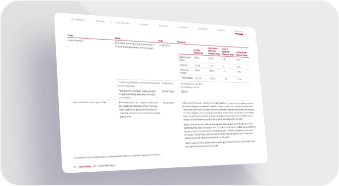CEO Message Overview Team Members Customers Community Environment Supply Chain Governance SASB Index 46 Tractor Supply 2021 Sustainability Report Topic Metric Code Disclosure Labor Practices (1) Average hourly wage and (2) percentage of in-store employees earning minimum wage* CG-MR-310a.1 Average Hourly Rate Count Above Applicable Minimum Wage Count at Applicable Minimum Wage % at Applicable Minimum Wage Tractor Supply Stores $14.93 36,672 185 0.5% Petsense $13.46 1,472 8 0.5% Distribution Centers $18.04 4,076 0 0.5% Total Company $15.18 42,220 193 0.5% (1) Voluntary and (2) involuntary turnover rate for in-store employees CG-MR-310a.2 Voluntary turnover rate 93% Involuntary turnover 7% Total amount of monetary losses as a result of legal proceedings associated with labor law violations CG-MR-310a.3 $226.38 Labor Conditions in the Supply Chain Percentage of (1) Tier 1 supplier facilities and (2) supplier facilities beyond Tier 1 that have been audited to a labor code of conduct, (3) percentage of total audits conducted by a third- party auditor CG-AA-430b.1 Tractor Supply Company contracts with a leading provider of supply chain compliance solutions who has on-the-ground presence in over 84 countries to conduct our social and security audits. These social audits look to ensure compliance with SA800 international standards that examine 16 unique categories, such as working environment, safety of plant and equipment and working hours. The audits are conducted in person to assure we have insight into the facilities that we contract with and ensure compliance with the local standards within the region. Based on the results of an audit, we may require a follow-up audit within 90 days or up t o six months from the date of the original audit. For all audits that result in a follow-up, we require the factory to follow a Corrective Action Plan (CAP) agreed to with the auditors at the conclusion of the audit. Tractor Supply conducts training that provides vendors with tools to help them address issues that might be discovered during the audits. Tractor Supply conducts training where vendors are provided the tools to help address issues that might be discovered during the audits. *This calculation does not include bonuses or paid leave related to COVID-19 and is for active employees as of FY 2021 end.
